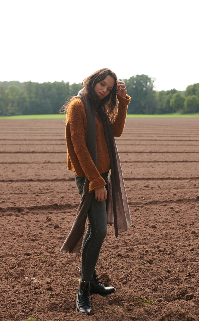 Janina trägt den kuschligen Bouclepullover BOBBY mit kleinem Rüschendetail am Ärmelsaum in der Farbe cognac (auch in der Farbe „grau“ erhältlich) kombiniert mir dem feinen Mohair XL-Tuch SUNNY in der Farbe dunkelbraun🤎
